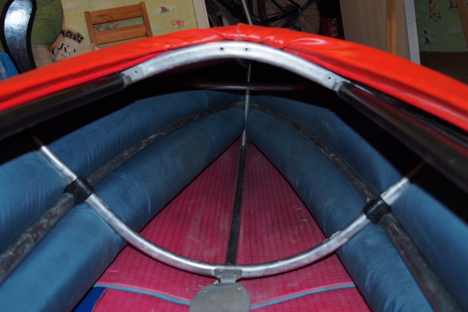 У каяка есть бедренные упоры, которые позволяют кренить лодку. Представляют собой две продольные трубы вдоль очка. Не скажу, что упоры шибко удобные, но это лучше, чем ничего. Пяточного упора нет, его роль у меня обычно выполняла туго набитая герма в носу лодки. Сиденье и спинка в моей модификации отсутствуют, слышал, что в более поздних моделях эти опции появились.